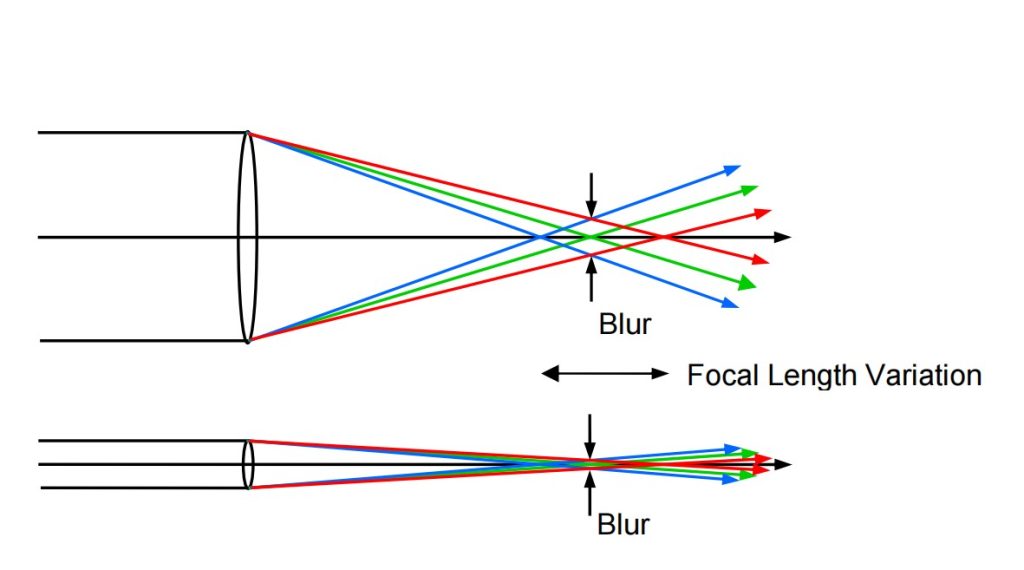 Early core problem: Chromatic aberration locked the usable aperture, forcing a trade-off between resolution and light throughput.